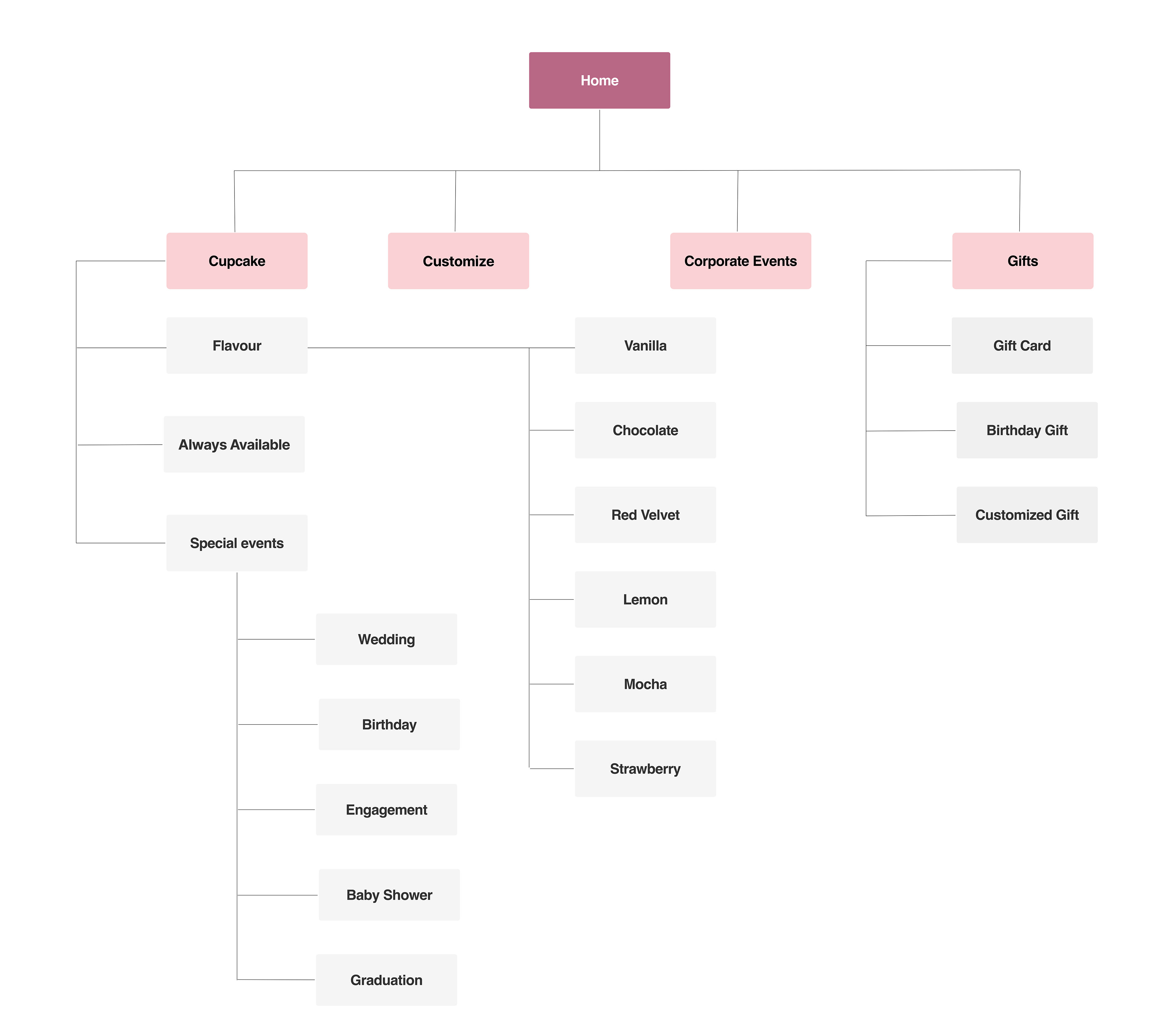 Presented here is the site map that summarizes the website's information architecture. It was created based on the answers we received from the user during the research phase.